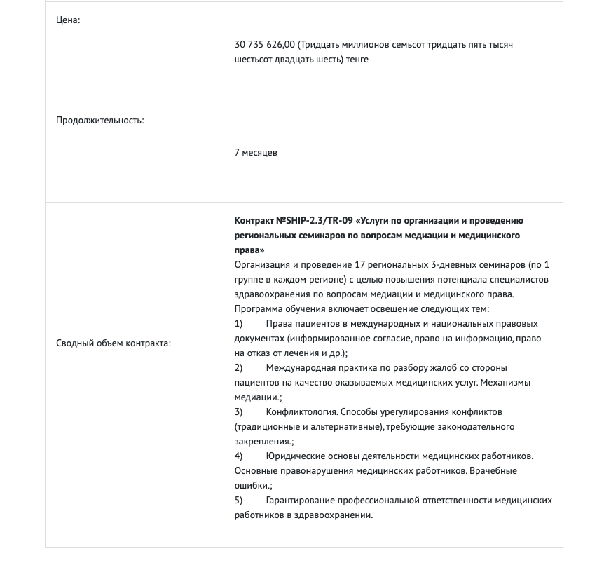 Еще одна многомиллионная услуга по организации и проведению региональных семинаров по вопросам медиации и медицинского права досталась ОО "Ассоциация независимых медицинских экспертов города Астаны" в консорциуме с ЧУ Международный центр медиации и права "Согласие". Возглавляет Ассоциацию экспертов Жанар Шукенова. Известно, что в свое время она работала в столичном управлении здравоохранения. Ее эксперты консультируют по всему Казахстану, и компания активно участвует в госзакупках. За семинары ОСМС независимые эксперты получили 30,7 миллиона тенге.
