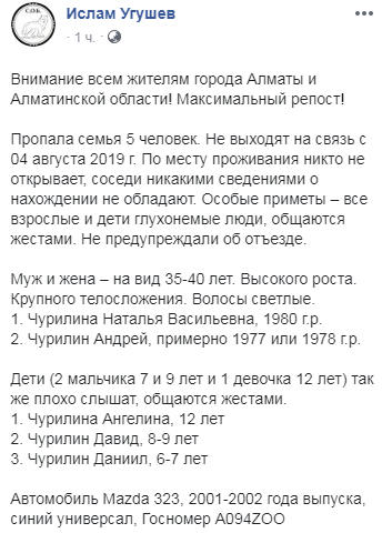 При странных обстоятельствах пропала семья из пяти человек в Алматы, сообщает BNews.kz. Информация о розыске появилась на странице общественника Ислама Угушева в Facebook.