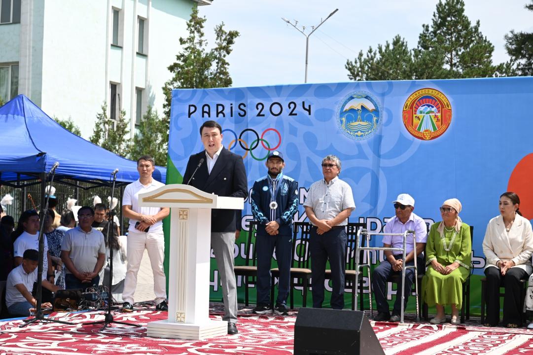 Вернувшись из Франции сразу на малую родину, олимпийский чемпион встретился с земляками на центральной площади города Жаркента.