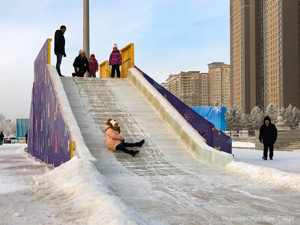 Ледовая горка построена неподалёку от катка в Президентском парке. Длина ската составляет более 160 метров. По словам замакима, это самая высокая горка в Астане и самая большая в Казахстане.