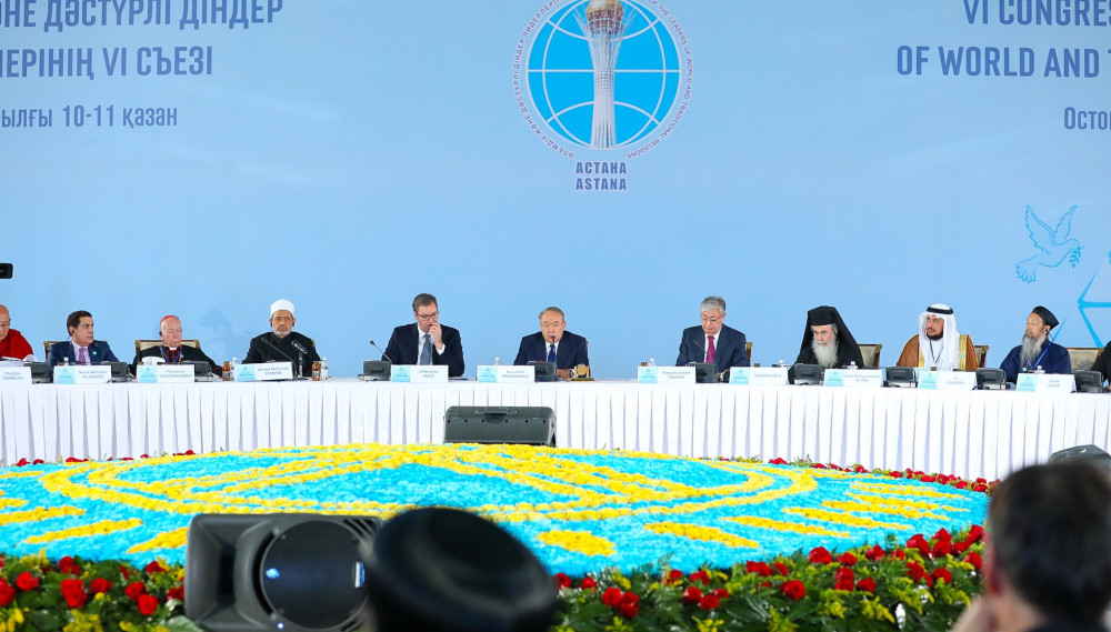 "На фоне сложных, тревожных процессов Астанинский съезд мировых и традиционных религий должен стать эффективным инструментом решения застарелых проблем. Они могли бы заключаться в следующем. Первое, как известно несмотря на то, что международное сообщество принимает решительные меры по предотвращению терроризма его идейную гуру, прикрываясь религиозными лозунгами, не прекращает свой злонамеренный проект дестабилизации ситуации в мире путём культивации идеологии ненависти. Второе. Учитывая, что международный терроризм и насильственный экстремизм сегодня продолжает оставаться одним из самых главных и острых вызовов глобальному миру и безопасности, Совет мировых лидеров мог бы содействовать политическим лидерам мира преодолеть усиливающееся противоречие в мировой политике", - сказал Токаев.