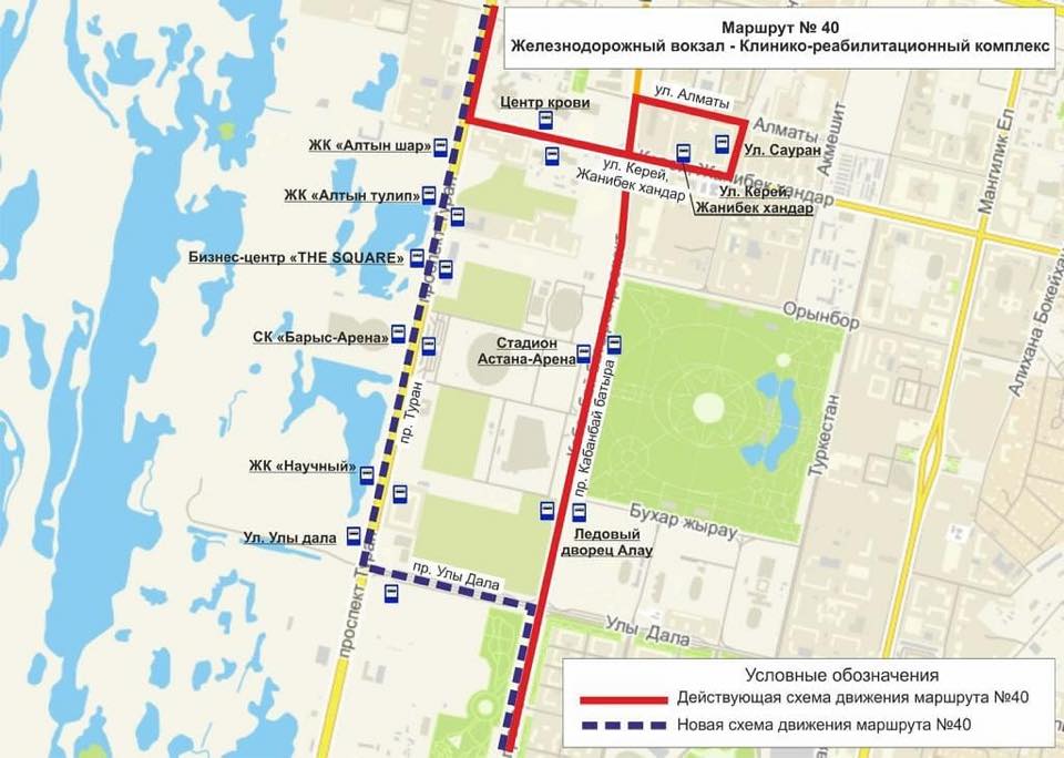 "По многочисленным просьбам пассажиров в целях транспортного обслуживания ледового дворца "Барыс-Арена", а также новых объектов по проспекту Туран, с 10 октября 2018 года, изменяется схема движения маршрута №40", - говорится в сообщении.