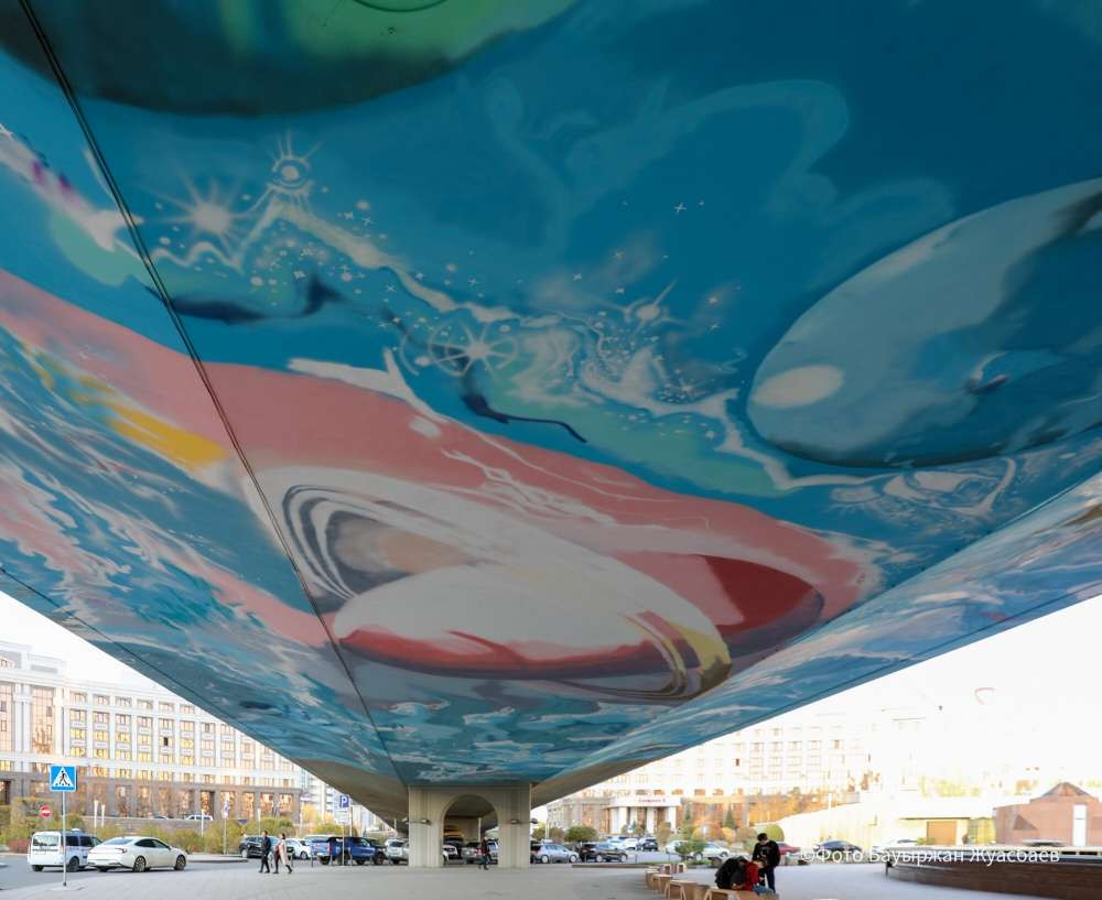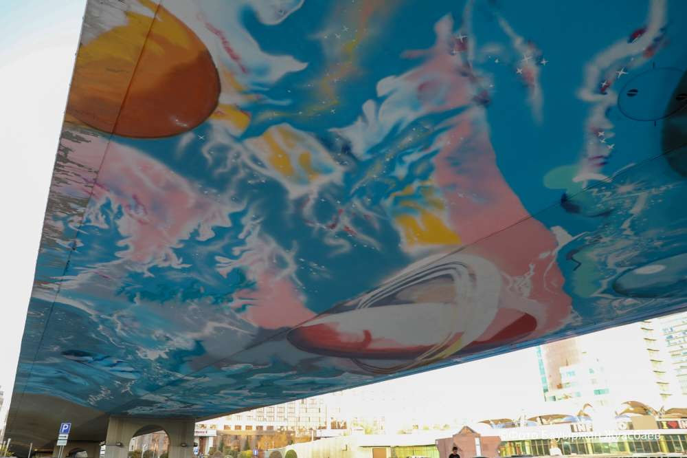 Продолжаем наш путь. Теперь мы в Есильском районе столицы. Роспись "Космическая среда" находится на подмостовой части Круглой площади. Ранее сообщалось, что этот мурал занимает 1000 квадратных метров. Этому рисунку уже больше года, о нем стало известно еще в июле 2020 года.Как видите, краски не поблекли и рисунок виден все еще достаточно четко.