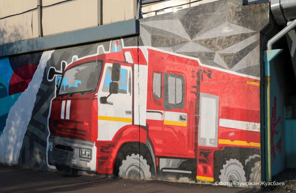 "Разрисован мост тематически. Изображены сотрудники МЧС, спасатели, пожарные. Раньше на месте сквера был огражденный участок, мы его трансформировали", - рассказывает Базыкен, отвечая на вопросы.