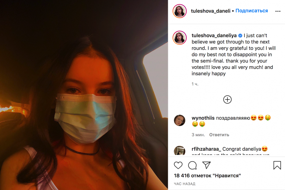 "Я просто не могу поверить, что мы прошли в следующий раунд. Я очень благодарна вам! Я постараюсь не разочаровать вас в полуфинале. Спасибо за ваши голоса! Всех вас очень люблю! Безумно счастлива!" - подписала свою публикацию юная вокалистка.
