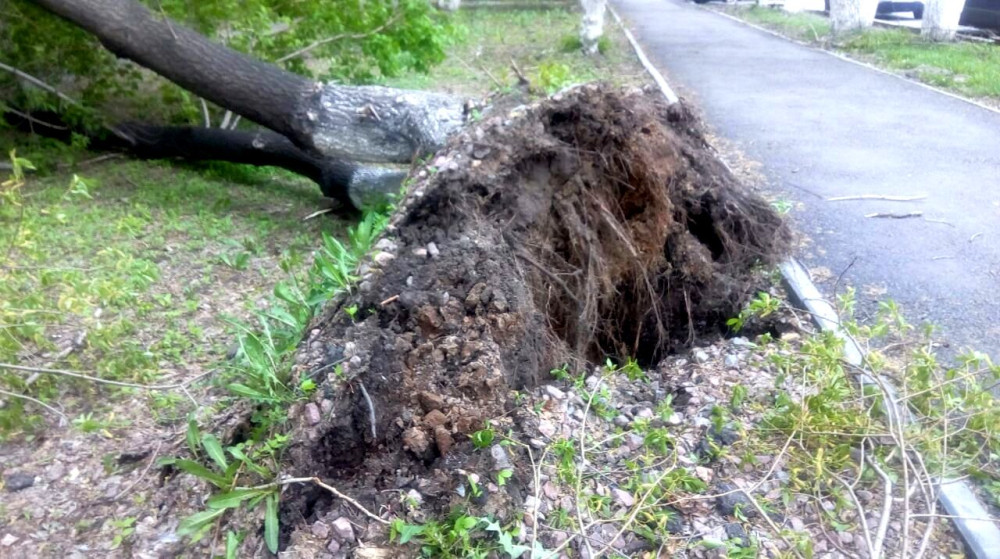 Сильный ветер в Петропавловске валит на землю деревья, передаёт корреспондент BNews.