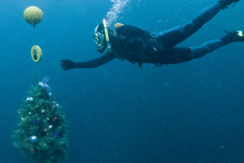 Под водой дайверы водили вокруг дерева хоровод, пили шампанское и пели песню "В лесу родилась елочка"