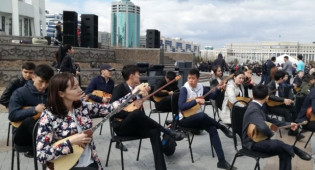 Масштабный домбра-флешмоб "Ұлы дала үні" прошёл под открытым небом у монумента "Байтерек".
