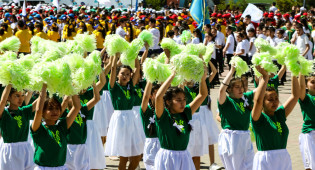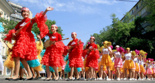 По реконструированной улице Панфилова прошли колонны барабанщиков, черлидеры, духовые оркестры и танцевальные коллективы.