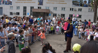 У здания областного полицейского ведомства развернулась детская площадка с аниматорами, игровыми снарядами, праздничной сценой, аттракционами и шарами.