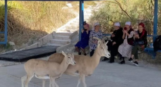 Как сообщается в публикации, животные гуляли на территории подземной мечети Бекет-Ата. На кадрах видно, что горные бараны достаточно смело приблизились к людям, а затем по