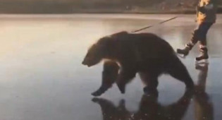 На видео попал эпизод, когда мужчина на коньках и с медведем по кличке Васька на поводке катается по озеру в Ярославской области.