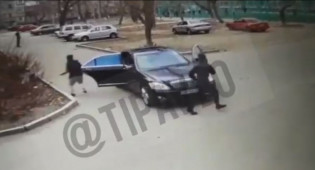 Подъезжает черный Mercedes. Из него выходит мужчина, открывает дверцу, вытаскивает ружье и бежит в сторону подъезда. Человек у подъезда с сигаретой убегает, из машин