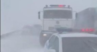 Полицейские и сотрудники ДЧС области сняли видео с заснеженных трасс. Они просят водителей ограничить выезд из-за бурана и почти нулевой видимости.