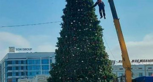 В Атырау елку украшали необычным способом: для этих целей к грузовому крану подвесили человека, передает BaigeNews.kz.