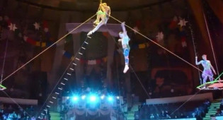 Сегодня в социальных сетях появилось видео, на котором видно, что во время представления артист цирка вместе с коллегой на плечах пытается пройти по канату на высоте, но не может уд