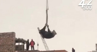 На кадрах видно, как корову привязали и прицепили к строительному крану. Затем животное парило в воздухе. На крыше строящегося дом