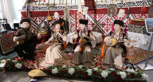 В центре "Казмедиа" развернулся настоящий праздничный аул со щедро накрытыми дастарханами, а гости нарядились в колоритные национальные костюмы.