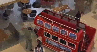 Двухэтажный прогулочный транспорт врезался в стеклянную стену и снёс её. Оказалось, что за рулём были дети, которые угнали
