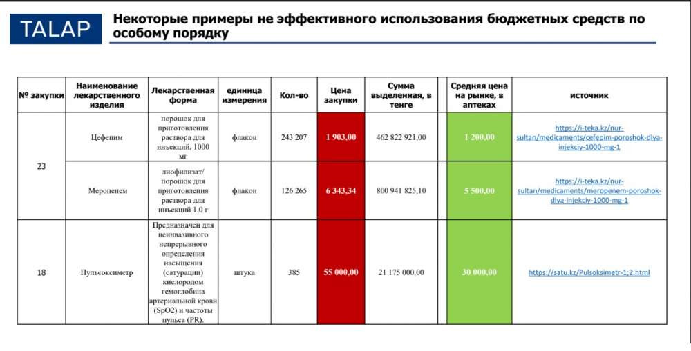 "СК-Фармация" закупает лекарственные препараты и пульсоксиметры по цене выше рыночной, сообщает корреспондент BaigeNews.kz со ссылкой на Центр прикладных исследований TALAP.
