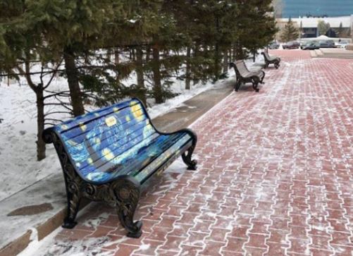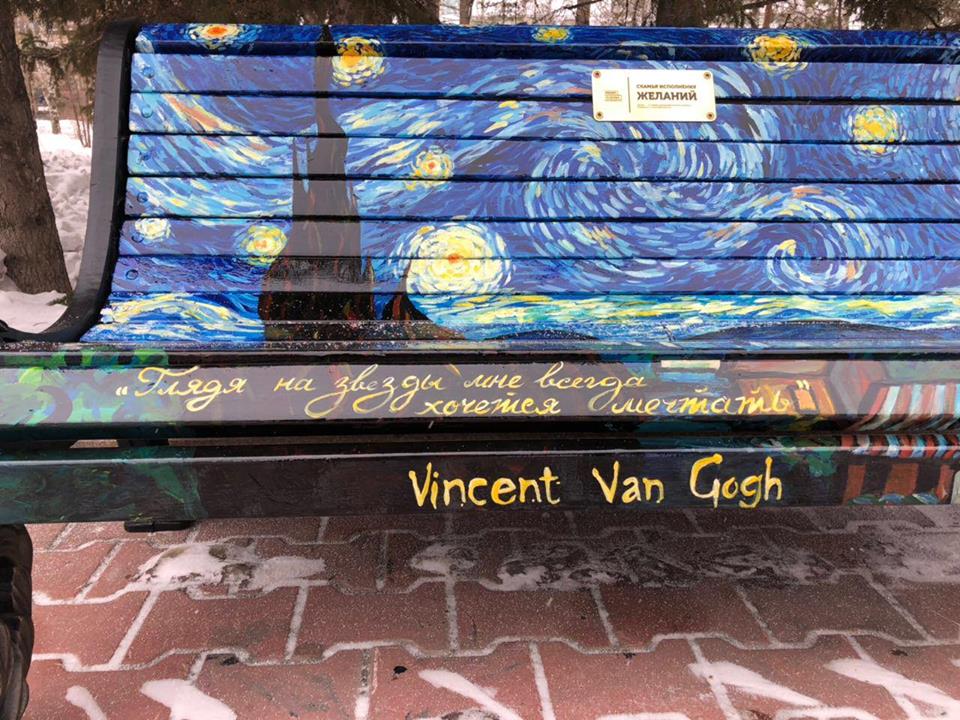 Шедевр "Дорога с кипарисом и звездой", написанную известным нидерландским художником Ван Гогом, переложили на астанинскую скамейку.