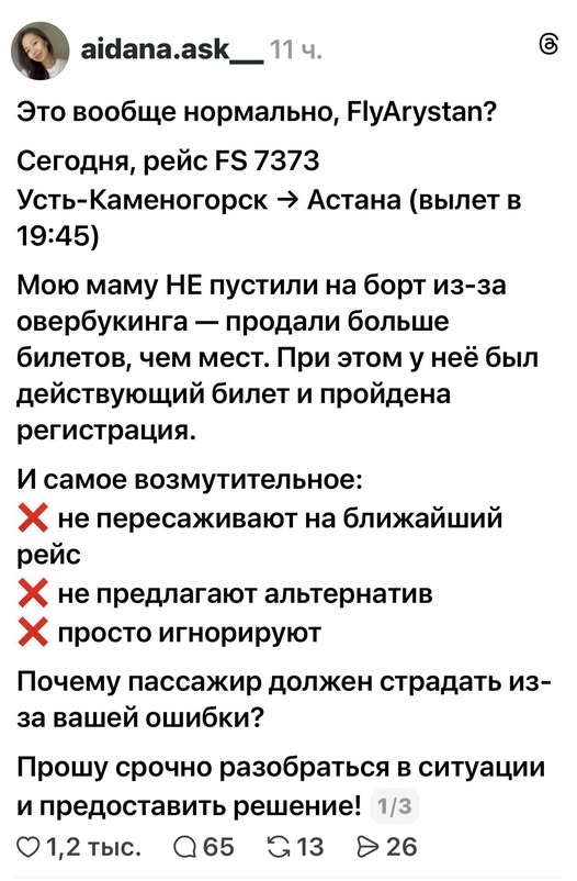 В социальных сетях обсуждают ситуацию с возможным овербукингом на рейсе авиакомпании FlyArystan из Усть-Каменогорска в Астану. Поводом для обсуждения стал пост пользователя, которая сообщила, что ее мать не пустили на борт, несмотря на наличие действующего билета и пройденную регистрацию.