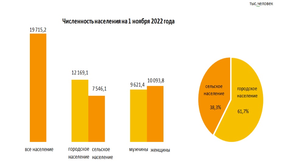 Численность населения страны на 1 ноября 2022 г. составила 19 715,2 тыс. человек, в том числе городского — 12 169,1 тыс. (61,7%), сельского — 7 546,1 тыс. (38,3%) человек, передаёт BaigeNews.kz. По сравнению с началом 2022 года численность населения увеличилась на 212 тыс. человек, или на 1,1%.