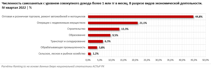 Почти половина миллионеров получали такой высокий доход, работая в торговле (44,8 процента). Более 21 процента из числа самозанятых с зарплатой от 1 миллион тенге составляли владельцы бизнеса или независимые эксперты в сфере недвижимости. На третьем месте в списке отраслей для миллионеров оказалось строительство (13,3 процента). Самую скромную долю среди богачей занимали фермеры (1,2 процента).