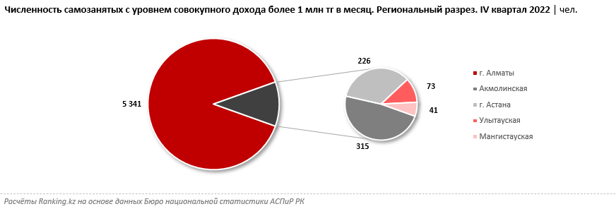 Распределение бизнесменов-миллионеров по регионам весьма неравномерное. 89 процентов всех учтённых самозанятых с зарплатой от одного миллиона тенге составляли алматинцы (5,3 тысячи человек). Ещё девять процентов, или 541 человек, жили в Астане и Акмолинской области. Совсем маленькая доля (около 2 процента) была распределена между богатыми предпринимателями Мангистауской и Улытауской областей. В остальных регионах самозанятых с миллионными доходами не было зафиксировано.