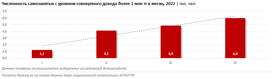 С 2022 года специалисты Бюро национальной статистики Казахстана увеличили шкалу для определения самых богатых среди самозанятых казахстанцев. Теперь наиболее обеспеченных предпринимателей и независимых работников считают по доходу от одного миллиона тенге, а не от планки в 500 тысяч тенге, как было в 2021 году.