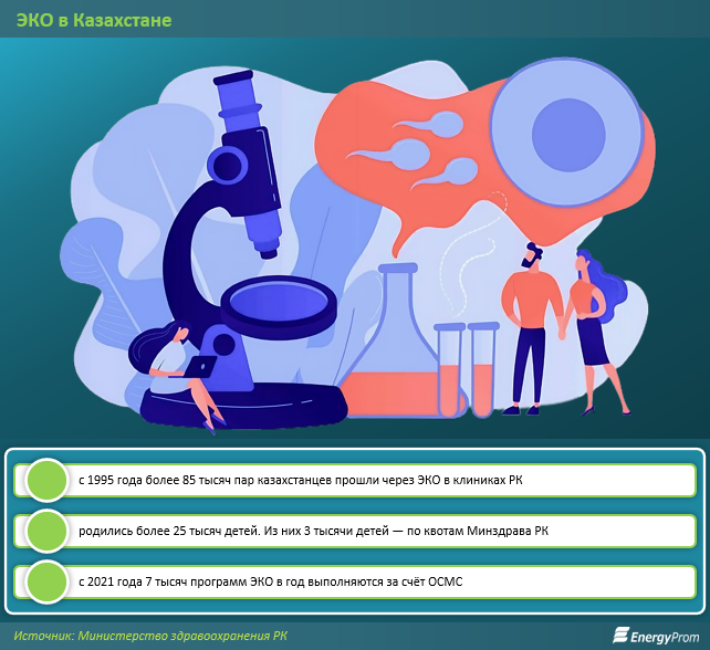 Казахстанское ЭКО считается качественным и недорогим, что в числе прочего привлекает иностранцев. По оценкам экспертов Казахстанской Ассоциации репродуктивной медицины, каждая шестая пара в стране бесплодна, передаёт BaigeNews.kz со ссылкой на Energyprom. В 45 процентов случаев преодолеть диагноз и родить ребёнка эти пациенты могут только с помощью технологий искусственного оплодотворения.