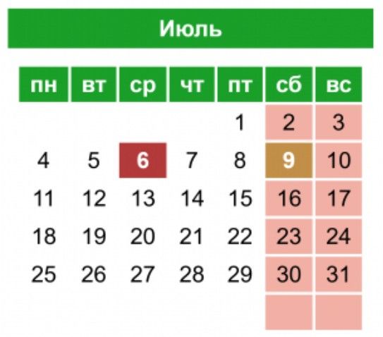 Получается, что для тех, кто на пятидневке, рабочими в июле будут 20 дней, выходными - 11. При шестидневной рабочей неделе трудится нужно будет 25 дней, отдыхать - всего шесть.