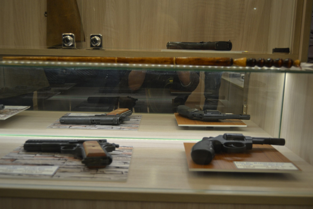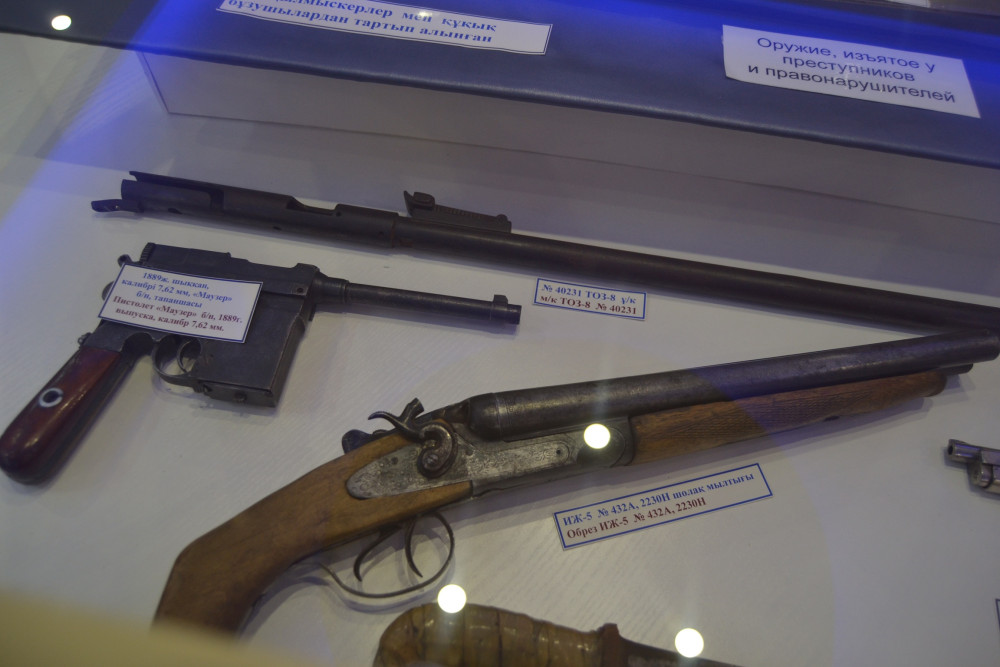 «Мы оружие делим на 2 категории, первая – это оружие которое изъято у преступников и вторая- оружие, добровольно сданное населением. Наша оружейная комната – единственная в Казахстане, в которой собрано 72 вида огнестрельного, газового и травматического оружия. Здесь расположены мушкеты, маузер 1880 года, воспетый Маяковским, револьверы системы наган, пистолет – пулемет, который был на чеченской войне. Сейчас он уже снят с производства», - рассказала Осинская.