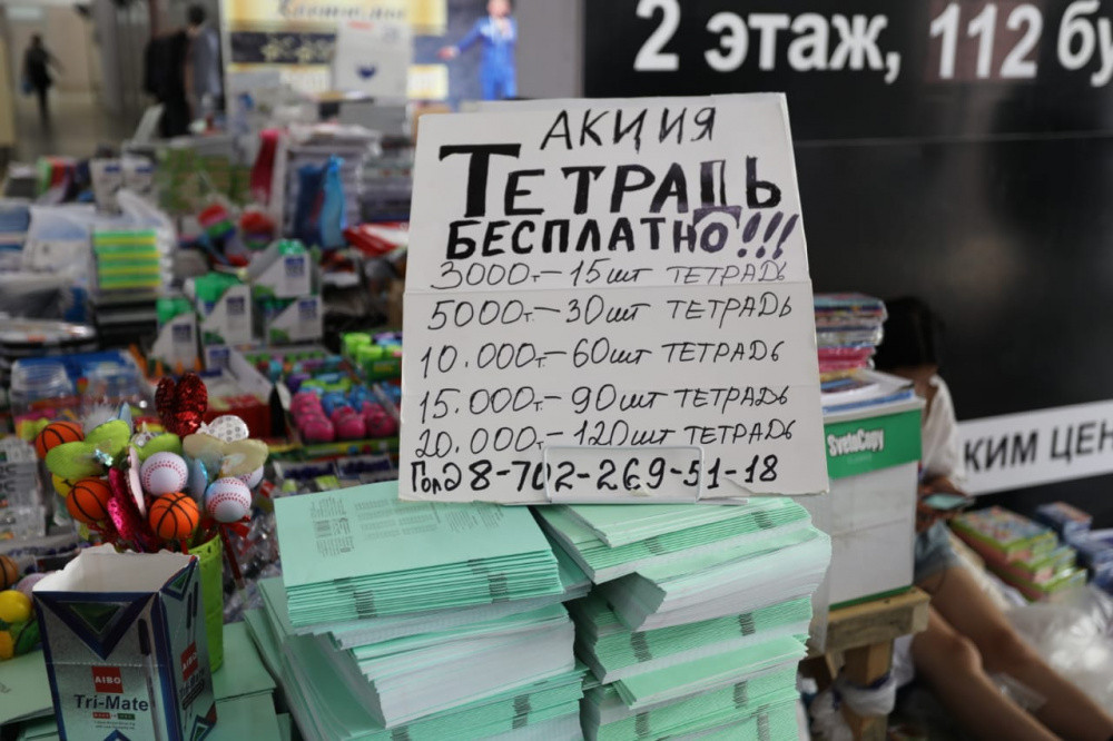 "У нас сейчас акция, если покупаешь канцелярские товары, то тетради даем в подарок. К примеру, если купили канцелярские товары на 5 тыс. тенге, то 20-30 простых тетрадей можно получить в подарок", - сообщила продавец Молдир Ордабаева.