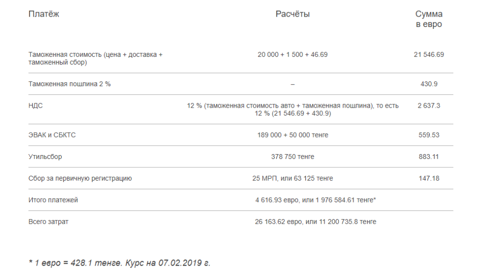 После растаможки нужно уплатить НДС, который сегодня равен 12 % от таможенной стоимости авто, сложенной с растаможкой и таможенным сбором (20 000 тенге за декларацию, или 46.69 евро).