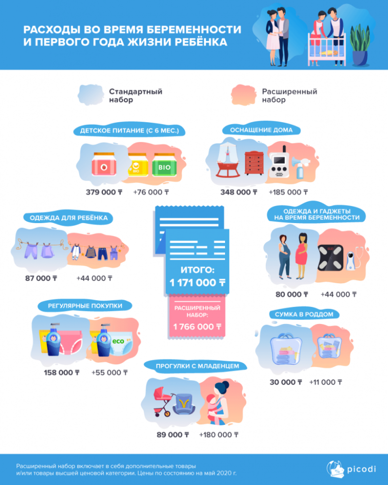 Суммируя все покупки, связанные с беременностью и первым годом жизни ребёнка, можно сказать, что траты на базовый набор составляют 1171000 тенге, а на расширенный — 1766000 тенге.