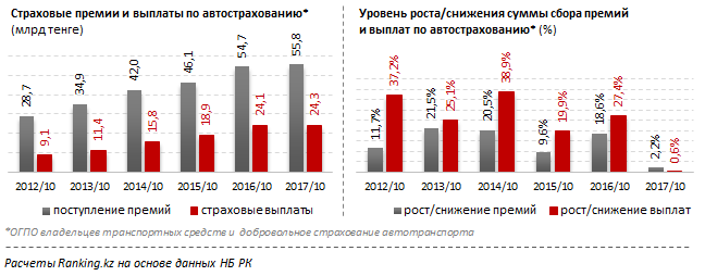В 2017 году в среднем хозяин за свой транспорт заплатил по 10,6 тыс. тенге за обязательную страховку, это всего на 1,4% больше затрат на страховку в прошлом году. Раньше эта сумма росла на 6,8% в год.