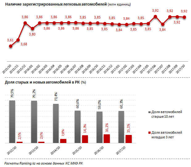 В Казахстане число авто в этом году увеличилось на 61,5 тыс. Этот рост связан с количеством старого транспорта. Продажи новых автомобилей не увеличиваются, дорогие машины с трудом доступны казахстанцам. Так, количество автомобилей возрастом младше 3 лет снизилось на 28,9 тыс. (-4,7%). При этом число транспорта старше 10 лет выросло на 88,2 тыс. (3,9%).