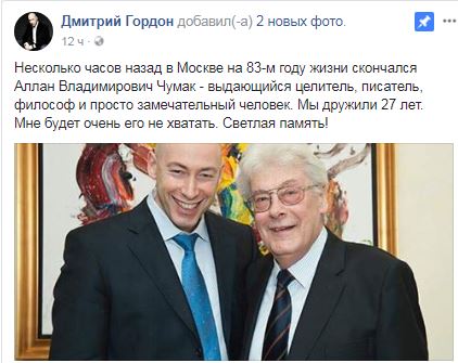 «Несколько часов назад в Москве на 83-м году жизни скончался Аллан Владимирович Чумак - выдающийся целитель, писатель, философ и просто замечательный человек. Мы дружили 27 лет. Мне будет очень его не хватать. Светлая память!» - написал Гордон накануне вечером.