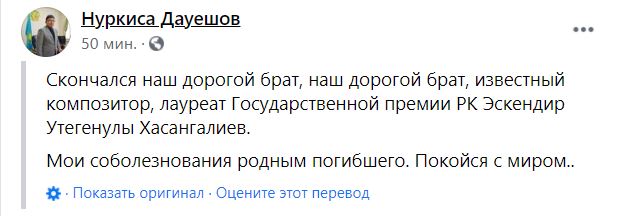 Об этом на странице в Facebook написал вице-министр культуры и спорта Нуркиса Дауешов.