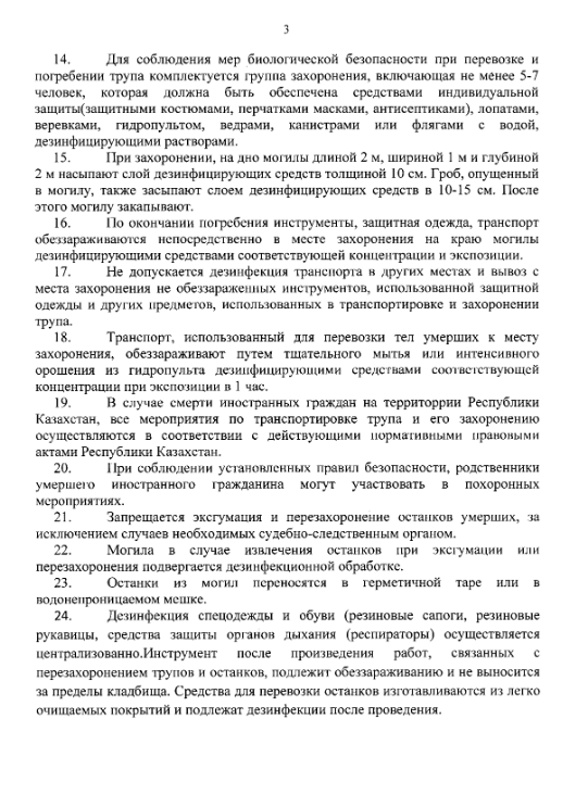 В случае смерти иностранных граждан на территории Республики Казахстан, все мероприятия по транспортировке трупа и его захоронению осуществляются в соответствии с действующими нормативными правовыми актами Республики Казахстан. А также при соблюдении установленных правил безопасности, родственники умершего иностранного гражданина могут участвовать в похоронных мероприятиях.