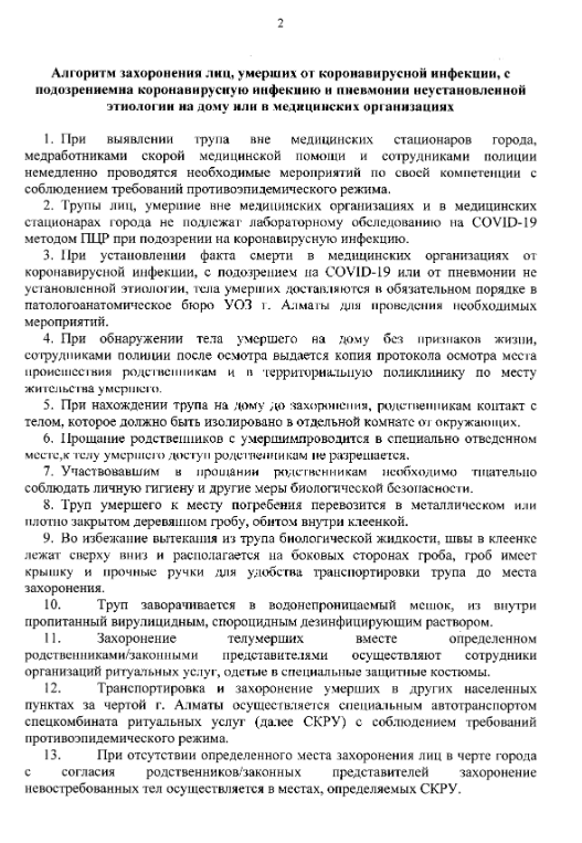 При установлении факта смерти в медицинских организациях от коронавирусной инфекции, с подозрением на COVID-19 или от пневмонии не установленной этиологии, тела умерших доставляются в обязательном порядке в патологоанатомическое бюро У03 города Алматы для проведения необходимых мероприятий.