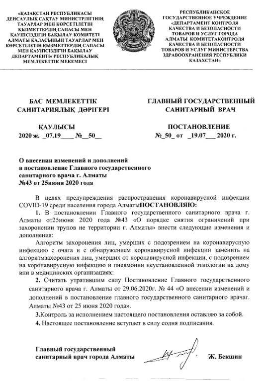 Скончавшиеся от "неизвестной пневмонии" будут похоронены по новым правилам в Алматы, сообщает BaigeNews.kz со ссылкой на Постановление главного государственного санитарного врача города Жандарбека Бекшина.
