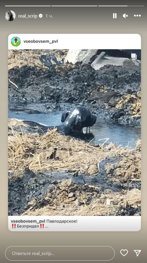 Рэпер Адиль Жалелов, выступающий под псевдонимом Скриптонит, у себя в сторис поделился постом павлодарского паблика с шокирующими кадрами гибели животных из-за нефтяных отходов, передаёт BaigeNews.kz.