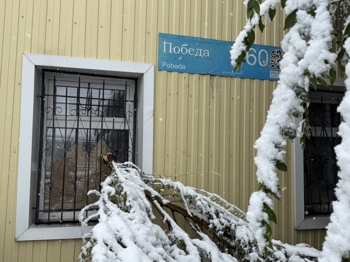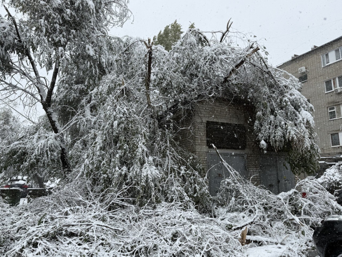 Тяжёлый мокрый снег ломает деревья под своим весом. Одна из подстанций уже оказалась под завалами, а в парке Победы и центральном сквере — десятки искривлённых, сломанных веток и даже треснувшие стволы.