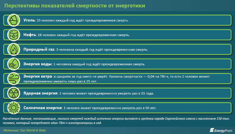 В исследовании также приводится в пример другой показатель — уровень смертности в перспективе. Аналитики посчитали, сколько смертей каждый источник энергии вызовет в среднем городе Европейского союза с населением 150 тысяч человек, который потребляет один ТВт/ч электроэнергии в год. Например, если бы этот город работал исключительно на угле, то каждый год от этого преждевременно умирали бы по крайней мере 25 человек, в первую очередь, от последствий загрязнения воздуха.