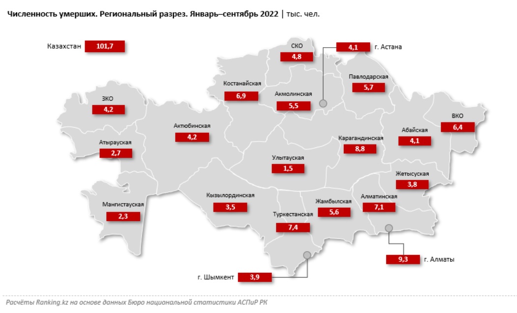 В региональном разрезе наибольшая численность умерших была зафиксирована в Алматы (9,3 тыс. человек - на 35,1% меньше, чем годом ранее), а также в Карагандинской (8,8 тыс. человек) и Туркестанской (7,4 тыс. человек) областях, наименьшая - ожидаемо в новообразованной Улытауской области (1,5 тыс. человек).