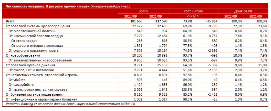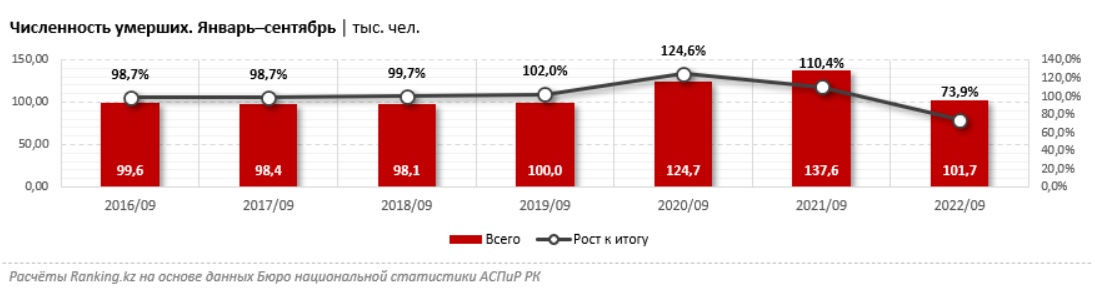 По итогам января–сентября текущего года численность умерших в РК составила 101,7 тыс. человек - на 26,1% меньше, чем годом ранее.
