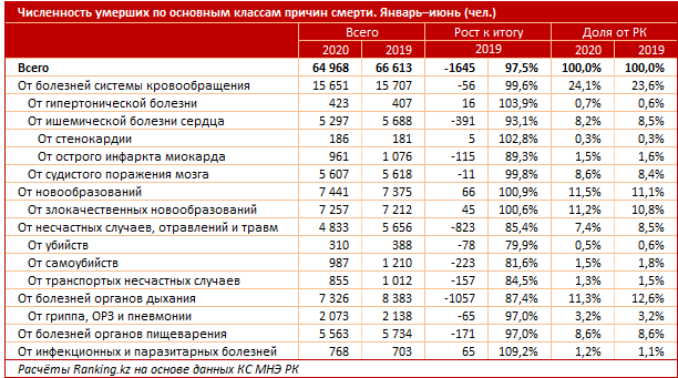 Смертность в Казахстане, по официальным данным Комитета по статистике, за шесть месяцев 2020 года сократилась по сравнению с аналогичным периодом 2019-го на 2,5 процента. При этом смертность в результате заболеваний органов дыхания снизилась сразу на 12,6 процента, передает BaigeNews.kz со ссылкой на Ranking.kz.