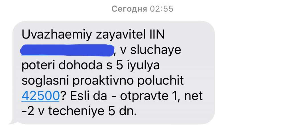"Уважаемый заявитель ИИН ...., в случае потери дохода с пятого июля согласны проактивно получить 42500? Если да - отправьте 1, нет - 2 в течение пяти дней".
